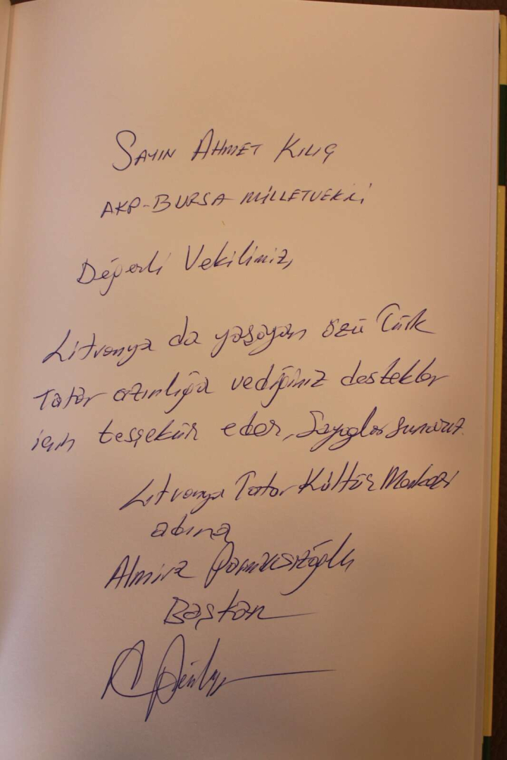Konuşmaların ardında Litvanya’nın Bursa Fahri Konsolosu Berat Tunakan ile BALKANTÜRKSİAD Yönetim Kurulu Başkanı Fatih Şakir, Litvanya’daki Tatar Kültür Merkezi Başkanı Almira Parmaksızoğlu’nun teşekkür mektubunu AK Parti Bursa Milletvekili Ahmet Kılıç’a takdim ettiler.