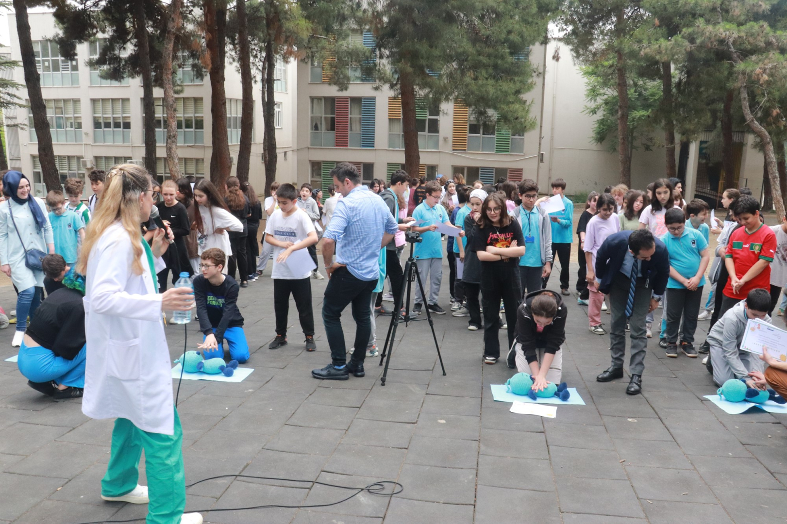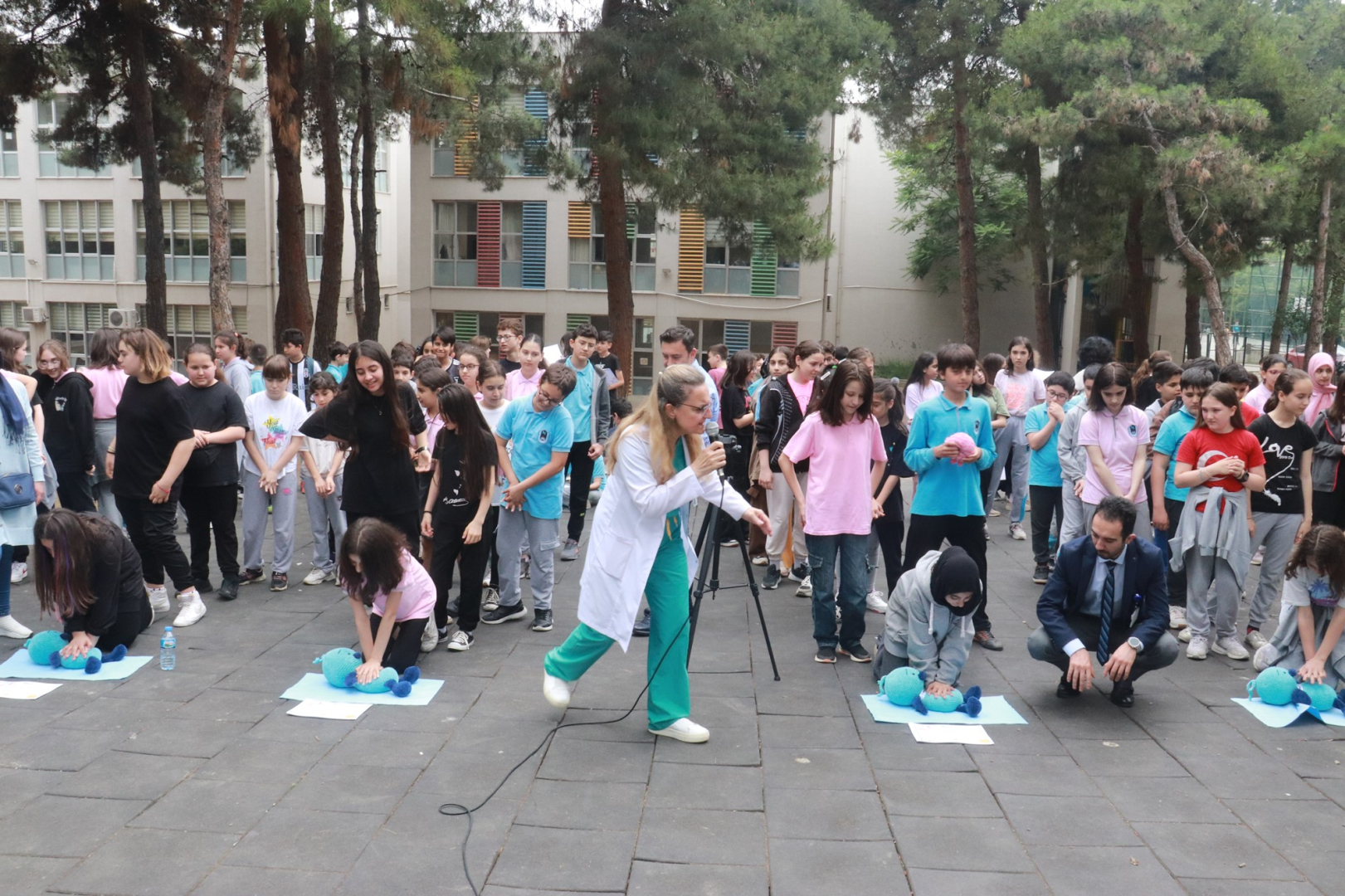 Acil müdahale yöntemlerinin eksik ya da yanlış uygulanmasının ciddi hayati riskler getirebileceğini ve ilk yardım müdahalelerinde kalp mesajının önemine dikkat çeken Prof. Dr. Aysun Yılmazlar, kalp masajının doğru uygulama biçimini de uygulamalarla öğrencilere gösterdi.