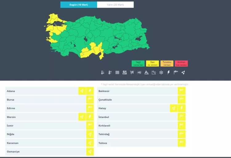 Kuvvetli yağış ve rüzgar beklenen Adana, Balıkesir,,Bursa Çanakkale, Edirne, Hatay, Mersin, İstanbul, İzmir, Kırklareli, Niğde, Tekirdağ, Karaman, Yalova ve Osmaniye için "sarı" kodlu uyarıda bulunuldu.