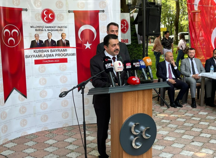 Bayramlaşma programında selamlama konuşması yapan MHP Bursa İl Başkanı Muhammet Tekin, "Kurban Bayramı'nızı en kalbi duygularla kutluyorum. İlk olarak Bursa'nın geleceği için 1/100.000 ölçekli planla ilgili parti olarak ciddi bir çalışma içindeyiz. İkincisi olarak Bursa Büyükşehir Belediyesi'nin 'Vizyon projesi' dediği; Demirtaş'tan Çalı'ya kadar ki metro istasyonu projesi bizim 25 sene önce partili büyüklerimizin projesidir. Bize düşen, bu vizyonu sürdürmektir. Sayın Büyükşehir Belediye Başkanımız bizden iktibas etmişler, iyi yapmışlar. Bizim milliyetçi ülkücü hareket olarak Bursa'da kendi projelerimizi desteklememek gibi bir lüksümüz yoktur, çünkü bizim projelerimiz bunlar. Milliyetçi Hareket Partisi dün ne yaptıysa bugün de o çizgide yoluna devam ediyor. Bütün dava arkadaşlarımızdan armudun sapı, üzümün çöpü demeden, önümüzdeki döneme Türk Yüzyılı çerçevesinde bakmalarını rica ediyorum. Terörsüz bir Türkiye, Müslüman Türk milletinin geleceği için Bursa'da üzerimize düşeni yapacağız" ifadelerini kullandı.