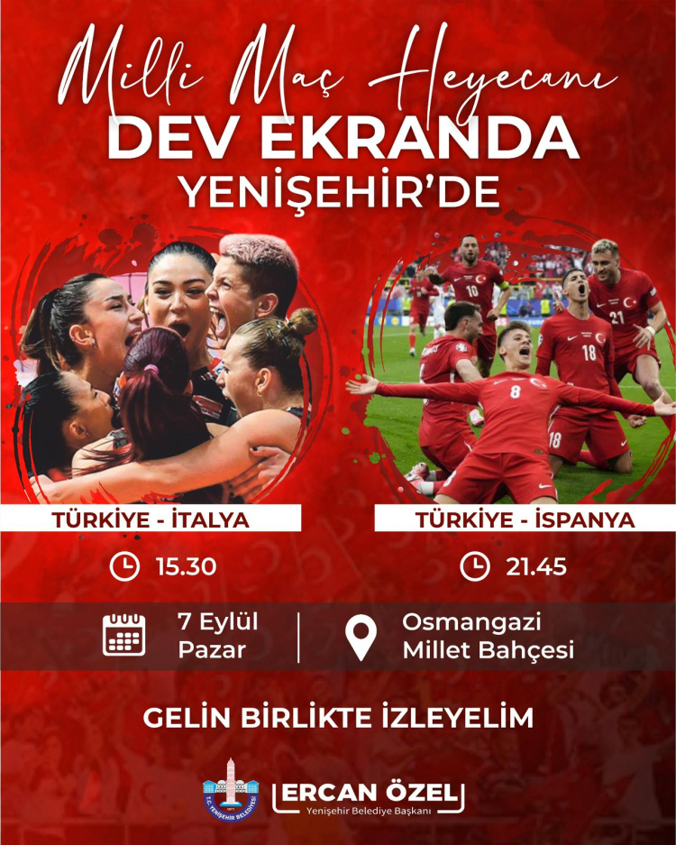 2025 FIVB Dünya Voleybol Şampiyonası Finalinde Türkiye-İtalya müsabakası ile 2026 FİFA Dünya Kupası E Grubu eleme ikinci müsabakası olan Türkiye-İspanya maçı için Yenişehir Belediyesi tarafından Osmangazi Millet Bahçesi'nde dev ekran kurulacak.