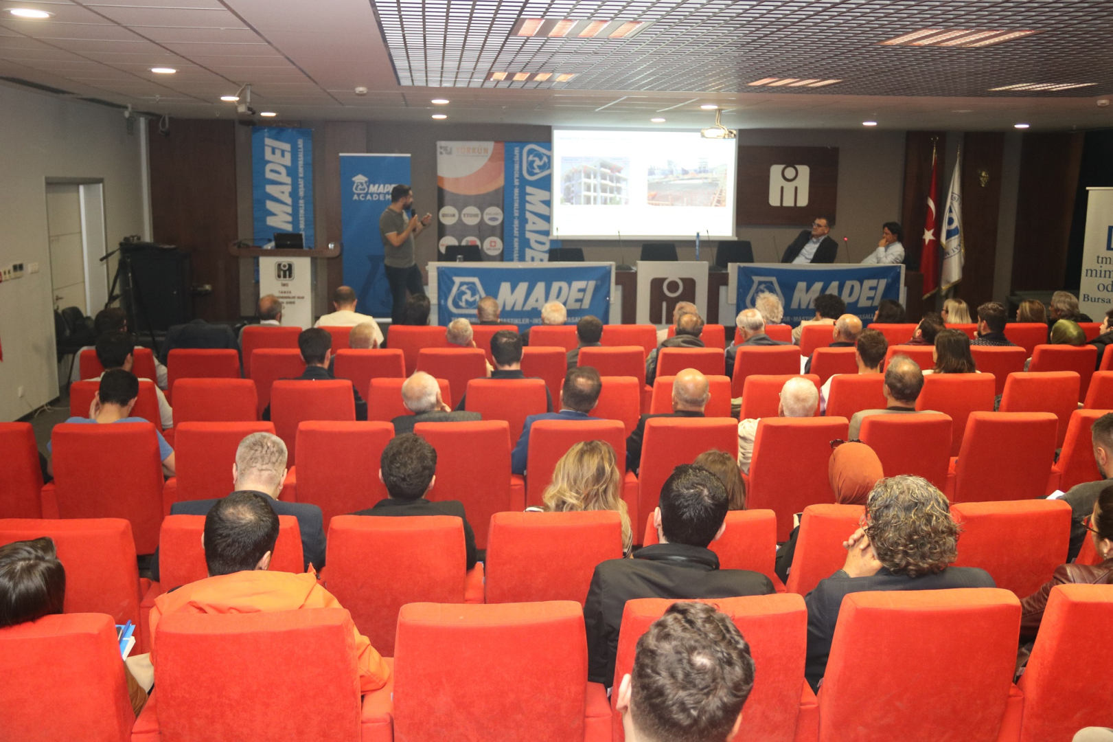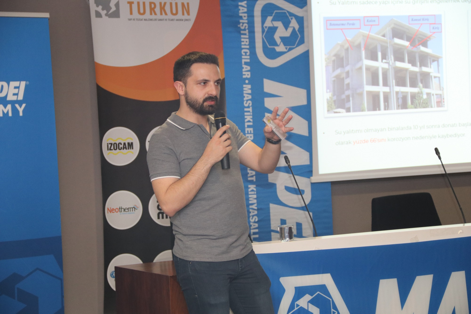 Programda bir sunum gerçekleştiren Mapei Teknik Destek Mühendisi Haluk İsmet Tekin, betonarme yapıların donatım mukavemetini zayıflatan, beton mukavemetini azaltan en önemli etkenin suya maruz kalması olduğunu belirtti. Tekin, “Bu durumun engellenmesi için yapının statik yapısına, durumuna, zemin etüdüne göre doğru su yalıtım sisteminin kullanılarak temelden başlayarak terasa kadar doğru yöntemlerle yalıtılması şarttır. Bu önlemler bina ömrünü uzatacaktır” dedi.