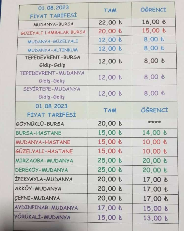 Ulaşıma yapılan bu zam doğrultusunda Mudanya-Bursa arası, Devlet Hastanesi - Mudanya ve Güzelyalı - Mudanya arası yolcu ve öğrenci taşıma ücretlerine zam geldi.