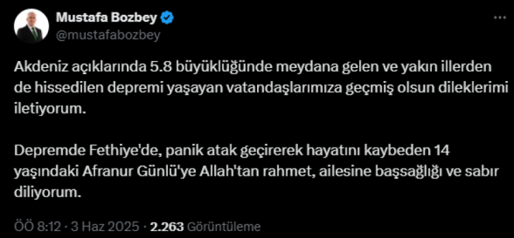 "Akdeniz açıklarında 5.8 büyüklüğünde meydana gelen ve yakın illerden de hissedilen depremi yaşayan vatandaşlarımıza geçmiş olsun dileklerimi iletiyorum. Depremde Fethiye'de, panik atak geçirerek hayatını kaybeden 14 yaşındaki Afranur Günlü'ye Allah'tan rahmet, ailesine başsağlığı ve sabır diliyorum."