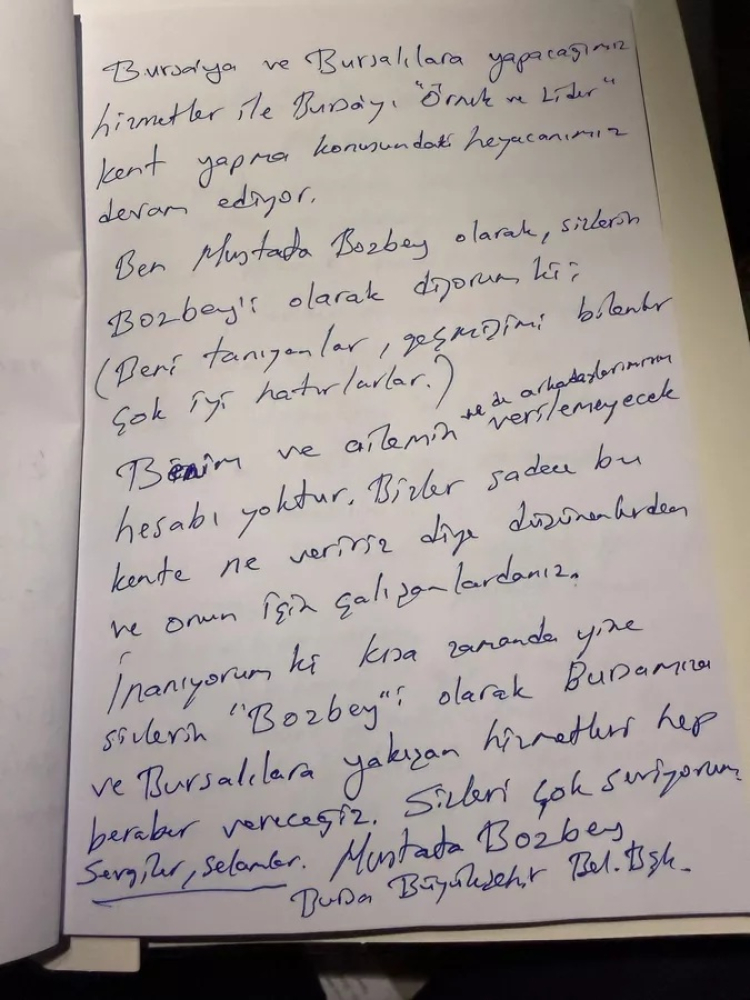 Bugün sabah saatlerinde gözaltına alınan Bursa Büyükşehir Belediye Başkanı Mustafa Bozbey , Bursa ve Bursasporlulara yazdığı mektubu sosyal medya hesabından paylaştı.
