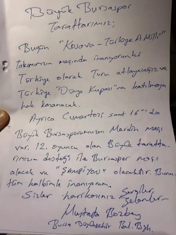 İfade işlemleri süren Bozbey'den Bursa ve Bursasporlulara hitaben mektup geldi.