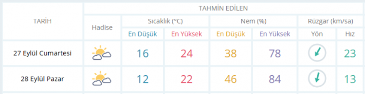 27 Eylül Cumartesi günü sıcaklık en düşük 16, en yüksek 24 derece olacak. Nem oranı %78'e kadar çıkarken, hissedilen sıcaklık 23 derece civarında olacak.