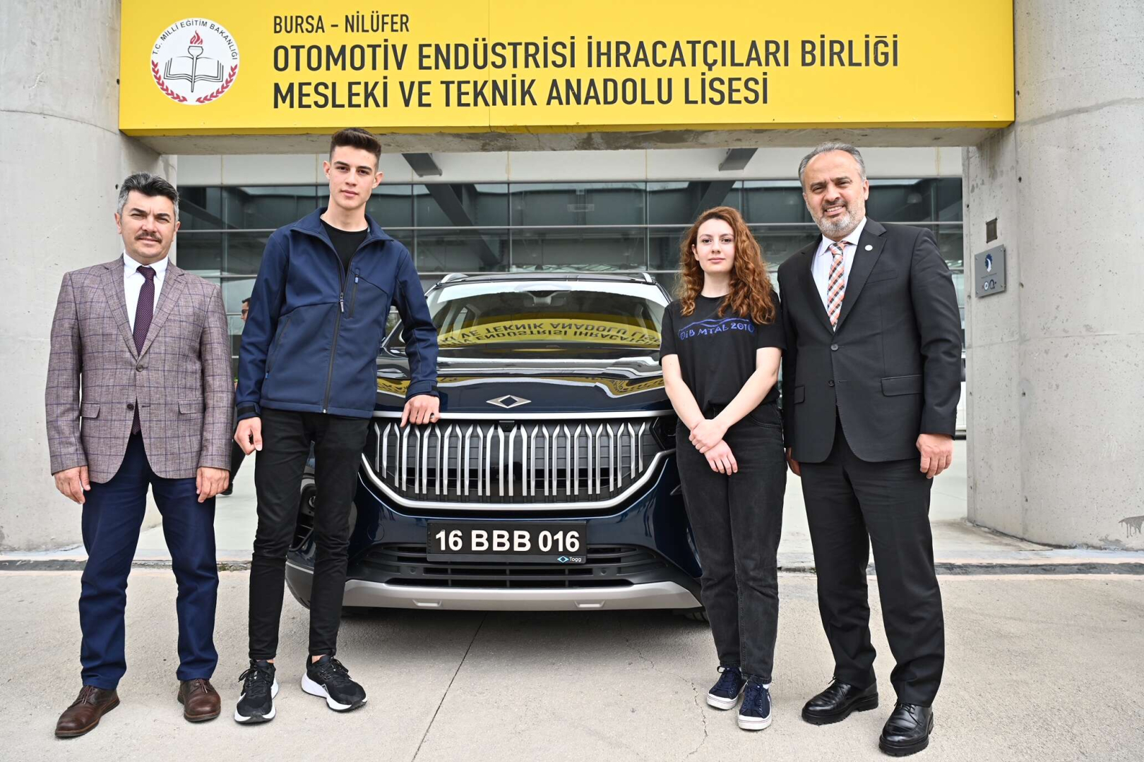 Bursa’nın Gemlik ilçesinde üretileceği gündeme geldiği ilk günden, aracın yollara çıktığı günümüze kadar kentte büyük heyecan uyandıran Türkiye’nin yerli ve milli gururu Togg, 16 BBB 016 plaka numarası ile Bursa Büyükşehir Belediyesi envanterine de girdi. Otomotiv sektörünün nitelikli iş gücü ihtiyacını karşılamak üzere Bursa’da kurulan Türkiye'nin ilk otomotiv lisesi, Otomotiv Endüstrisi İhracatçıları Birliği Mesleki ve Teknik Anadolu Lisesi’nde geçtiğimiz hafta düzenlenen festivale katılan Büyükşehir Belediye Başkanı Alinur Aktaş, Büyükşehir’e gelecek Togg’u ilk olarak bu okula getireceğine dair öğrencilere söz vermişti. Başkan Aktaş, dün gelen Togg ile birlikte ilk yolculuğunu da geleceğin otomotivcilerini yetiştiren bu okula yaptı. Öğrenciler tarafından okulun girişinde Türk Bayrakları ile karşılanan Togg, büyük heyecan uyandırdı.