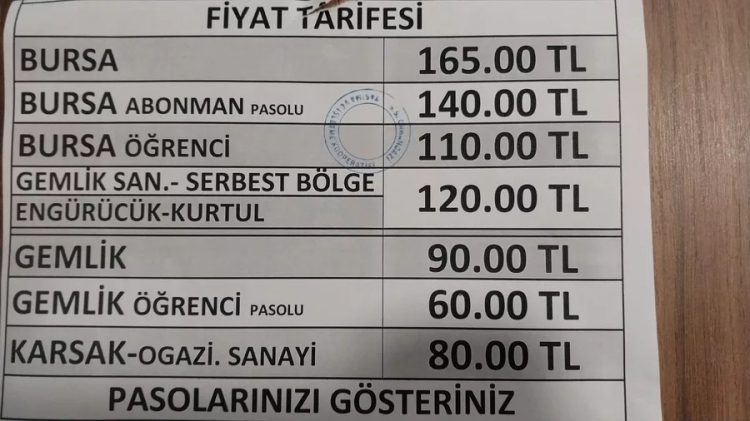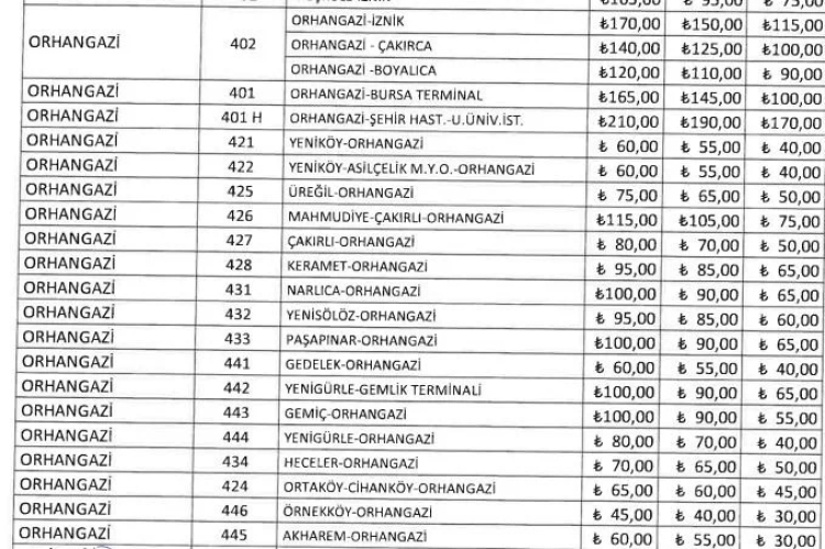 Yapılan düzenlemeyle birlikte Orhangazi-Bursa hattında yolcu ücreti 140 TL'den 165 TL'ye yükseldi. Aynı hatta öğrenci tarifesi ise 100 TL olarak belirlendi.