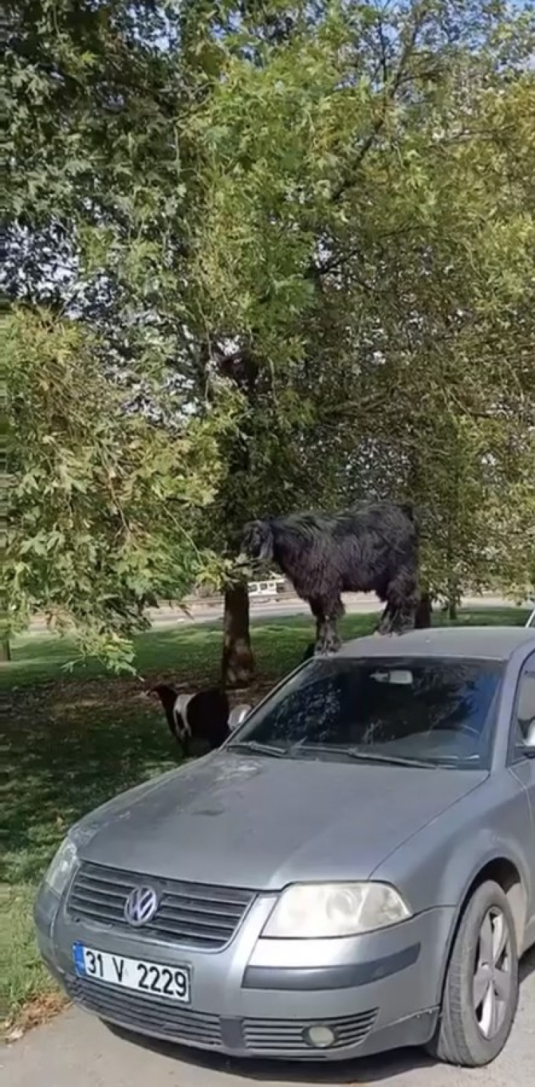 Otomobil üzerine çıkan keçi ağaç yapraklarını yedi