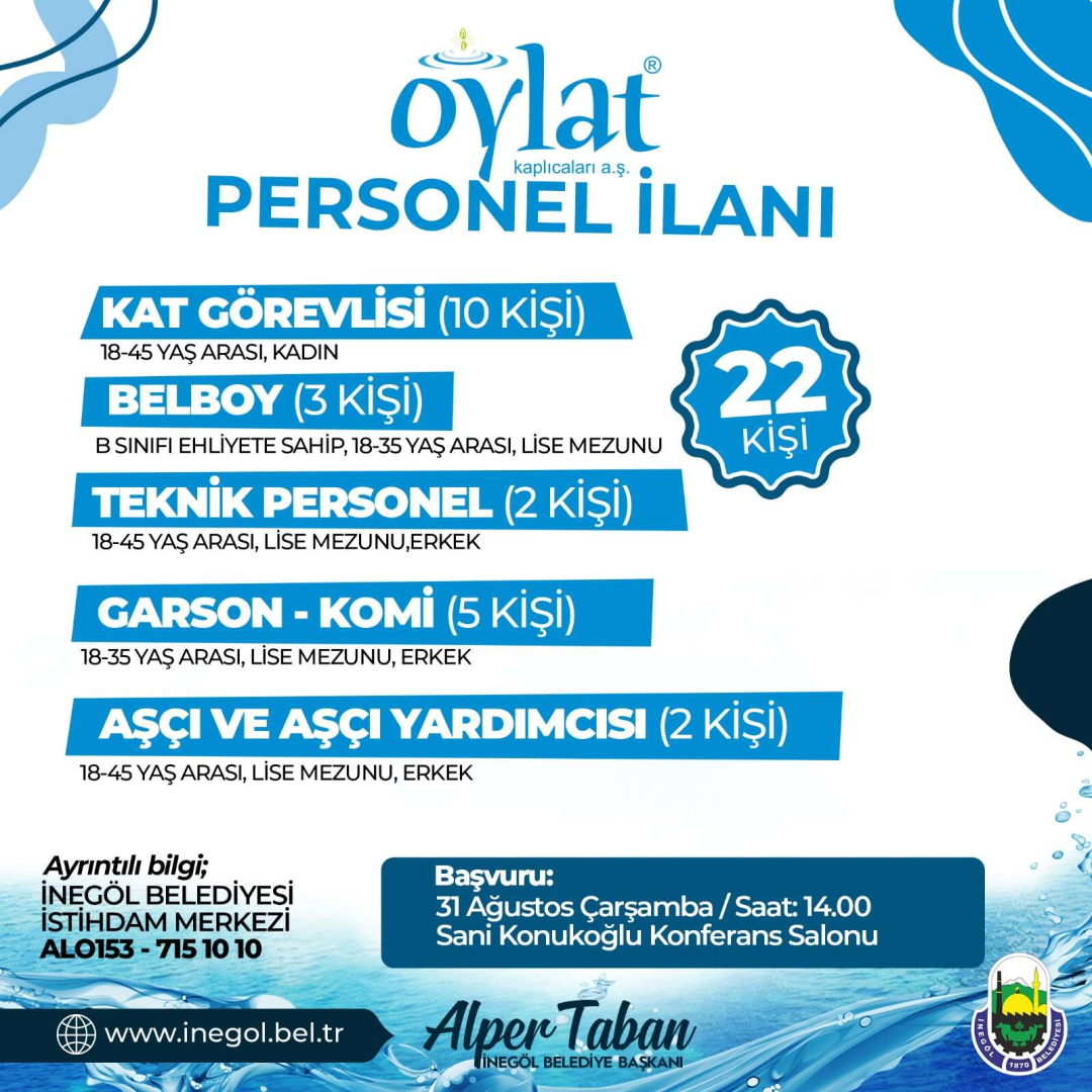 İnegöl Belediyesi İstihdam Merkezinden yapılan açıklamada, İnegöl’ün şifalı incisi Oylat Kaplıcalarında çalışmak üzere personel alımı yapılacağı duyuruldu. Açıklamada şu ifadelere yer verildi: “İstihdam Merkezimizle iş birliği yapan Oylat Kaplıcaları; kat görevlisi olarak çalışacak 18-45 yaş arası 10 kadın, belboy olarak çalışacak B sınıfı ehliyete sahip 18-35 yaş arası, en az lise mezunu 3 erkek, teknik personel olarak görev yapacak 18-45 yaş arası, lise mezunu 2 erkek, garson ve komi olarak çalışacak 18-35 yaş arası lise mezunu 5 erkek ile aşçı ve aşçı yardımcısı olarak çalışacak 18-45 yaş arası lise mezunu 2 erkek olmak üzere toplam 22 personel alımı yapılacak. Başvurular 31 Ağustos Çarşamba günü saat 14.00’da Sani Konukoğlu Konferans Salonunda alınacak. Yapılacak alımla ilgili detaylı bilgi almak isteyen vatandaşlar 153 hatları üzerinden ve 0 224 715 10 10 Nolu telefondan İnegöl Belediyesi İstihdam Merkezine ulaşabilirler.”