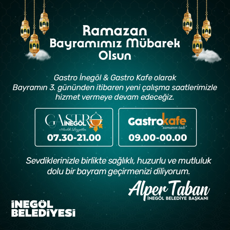 Öte yandan İnegöl Belediyesi’nin sosyal tesisleri Gastro İnegöl Restoranı ve Gastro Kafenin de bayram süresince çalışma programı belli oldu. Gastro tesisleri bayramın 1’inci ve 2’nci günü kapalı olacak. Üçüncü günü ise Gastro İnegöl Restoranı sabah 07.30 ile akşam 21.00 arasında hizmet verecek. Gastro Kafe de 3’üncü günü sabah 09.00 ile akşam 00.00 arasında açık olacak. Devam eden günlerde tesisler rutin çalışmalarını sürdürecek.