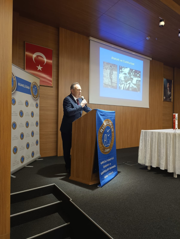 RUMELİSİAD, “Cumhuriyetin 101. Yılında Atatürk ve Cumhuriyet” konulu söyleşi kapsamında, Tarihçi-Yazar Dr. Naim Babüroğlu'nu üyeleriyle buluşturdu. NOSAB Yalçın Aras Toplantı Salonunda düzenlenen etkinliğe; Bursa Büyükşehir Belediye Başkan Vekili Yücel Akbulut, Nilüfer Belediye Başkan Yardımcısı Okan Şahin, BUMİAD Başkanı Mustafa Gümüş, NOSAB Başkanı Erol Gülmez, Bursa UNESCO Derneği Başkanı İlker Özaslan’ın yanı sıra RUMELİSİAD üyeleri ve eşleri katıldı.