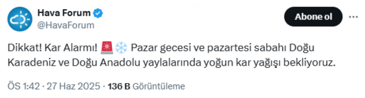 X platformu üzerinden yapılan açıklamada "Dikkat! Kar Alarmı! Pazar gecesi ve pazartesi sabahı Doğu Karadeniz ve Doğu Anadolu yaylalarında yoğun kar yağışı bekliyoruz" ifadelerine yer verildi.