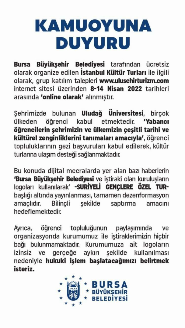 Zafer Partisi’nin sosyal medya üzerinden paylaştığı 'Bursa Büyükşehir Belediyesi Suriyeli gençleri İstanbul gezisine götürüyor’ paylaşımına Bursa Büyükşehir Belediyesi'nden yalanlama geldi.