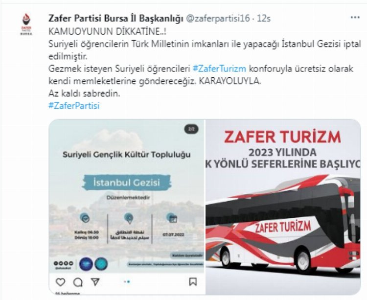 "KAMUOYUNUN DİKKATİNE..! Suriyeli öğrencilerin Türk Milletinin imkanları ile yapacağı İstanbul Gezisi iptal edilmiştir. Gezmek isteyen Suriyeli öğrencileri #ZaferTurizm konforuyla ücretsiz olarak kendi memleketlerine göndereceğiz. KARAYOLUYLA. Az kaldı sabredin.