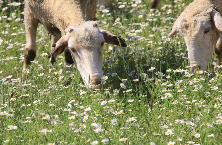 Dönümlerce alanda kendiliğinden yetişen papatyalar, doğanın kendi eliyle şekillenmiş gibi etkileyici bir güzellik sunuyor. Meralara çıkarılan Karacabey merinosu, kıvırcık ve Türktahirova ırkı koyun ve koçlar da kuzularıyla papatya manzarasında otluyor.