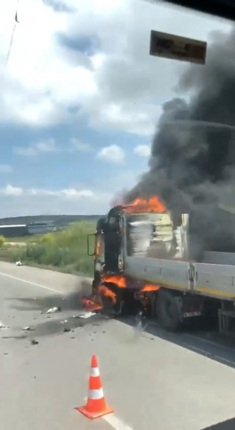 Edinilen bilgiye göre, Bursa'ya kilometreler kala dumanlar yükselen tırı yolun kenarına çeken sürücü, canını zor kurtardı. Tırdan inen sürücü, kendi imkanlarıyla yanan tırı söndürmeye çalışsa da mümkün olmadı.