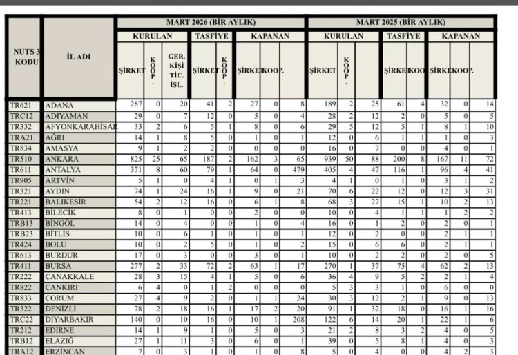 Tasfiye edilen şirket sayısı 75'ten 72'ye düşerken, tasfiye edilen kooperatif sayısı da 4'ten 2'ye indi. Kapanan şirket sayısı 62'den 63'e sınırlı bir artış gösterirken, kapanan kooperatif sayısı 2'den 1'e geriledi. Gerçek kişi ticari işletmelerde ise kapanış sayısı 13'ten 17'ye yükseldi.