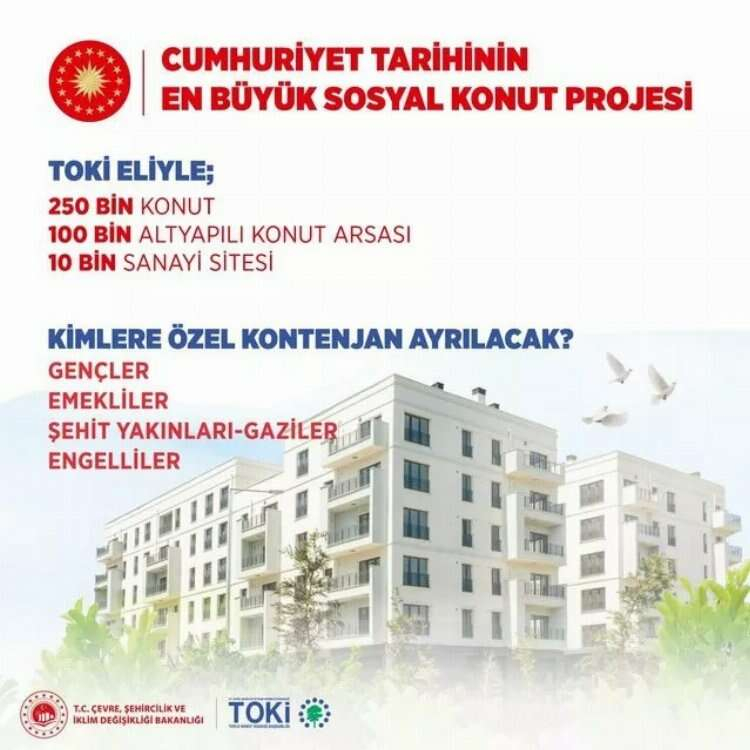Bu devasa sosyal konut projemizin ilk etabını oluşturan 250 bin konutu 2 yılda bitirerek hak sahiplerinin kullanımına sunmayı planlıyoruz. Projemizin bu ilk etabı dahi cumhuriyet tarihimizin en büyük sosyal konut atılımıdır.