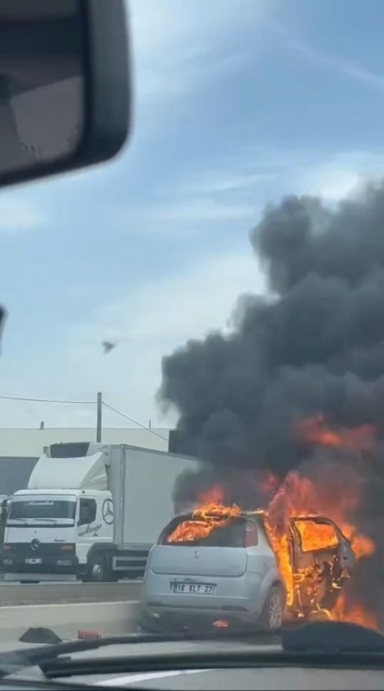 Bursa-Ankara karayolu İnegöl girişinde meydana gelen olayda, seyir halindeki bir otomobil motor bölümünden başlayan yangın sonucu alev topuna döndü.