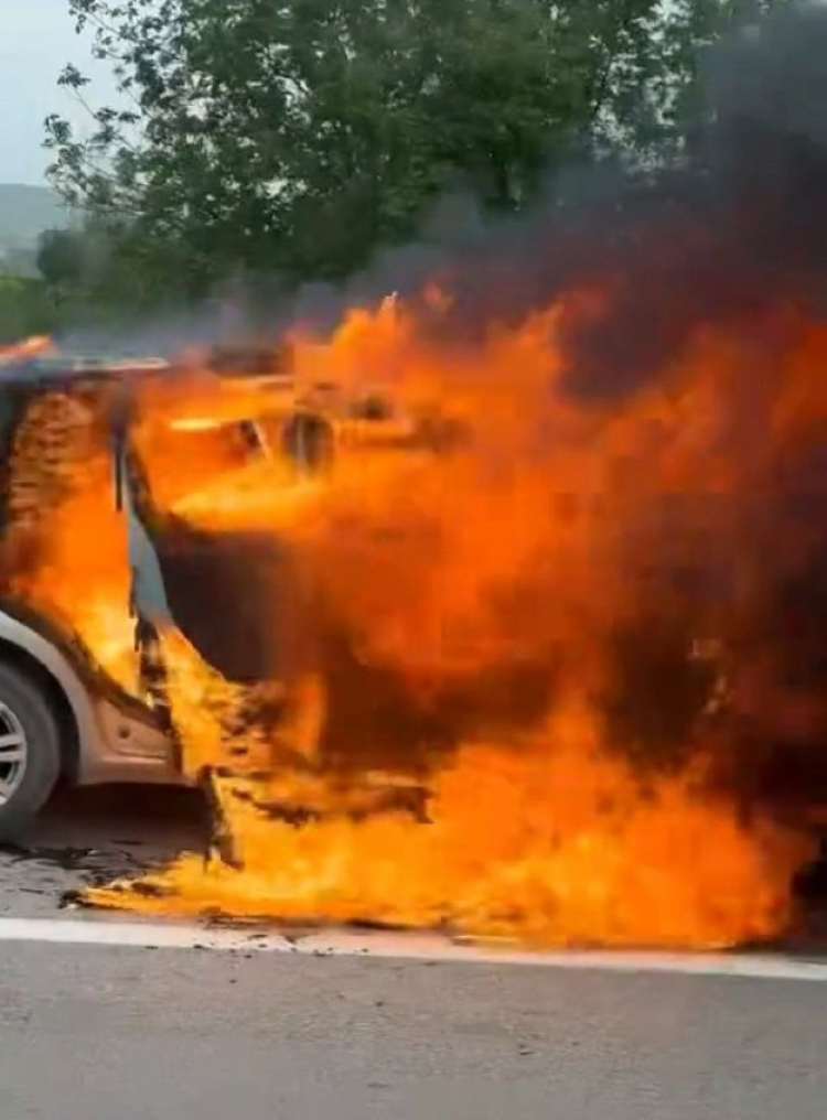 Durumu fark eden sürücü, aracı yol kenarına çekerek itfaiyeye haber verdi. Ancak kısa süre içerisinde araç alev alarak yanmaya başladı.