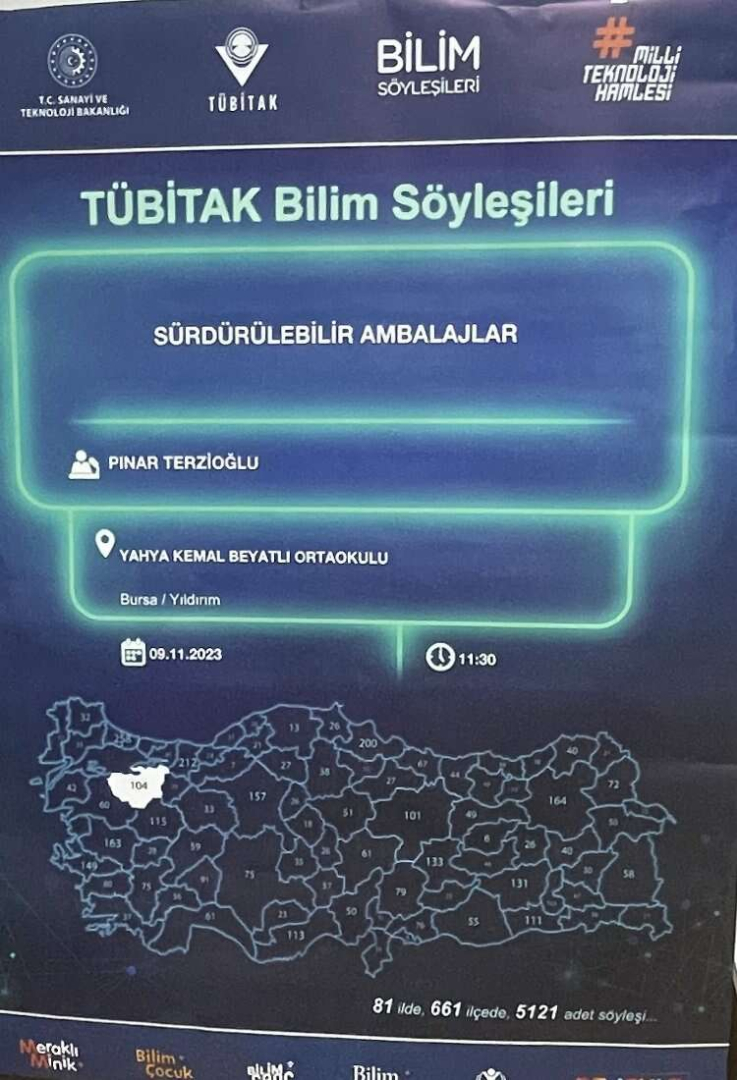 Bursa Teknik Üniversitesi (BTÜ) Mühendislik ve Doğa Bilimleri Fakültesi Polimer Malzeme Mühendisliği Bölümü Öğretim Üyesi Doç. Dr. Pınar Terzioğlu, TÜBİTAK Bilim Söyleşileri Etkinliği kapsamında Bursa Yahya Kemal Beyatlı Ortaokulu öğrencileri ile bir araya geldi. Söyleşide Terzioğlu’nun konusu ambalajlarda sürdürülebilirlik kavramı oldu. Etkinliğe, okul müdürü, öğretmen ve öğrenciler katıldı.
