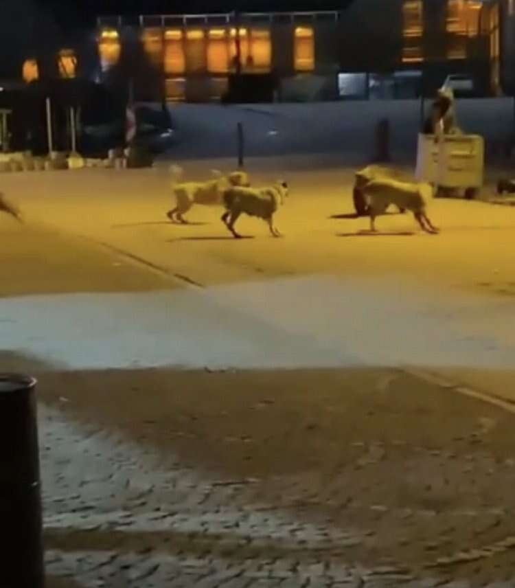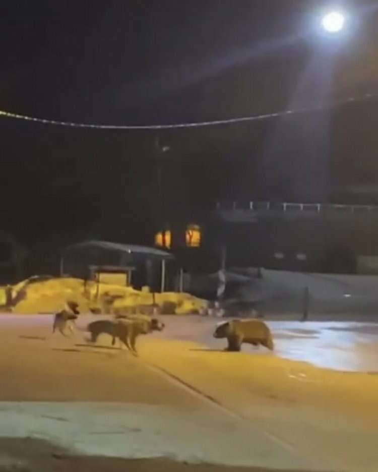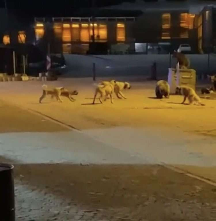 Yemek arayan ayılar ile köpek sürüsünün bu kavgası ise saniye saniye kameralara yansıdı.