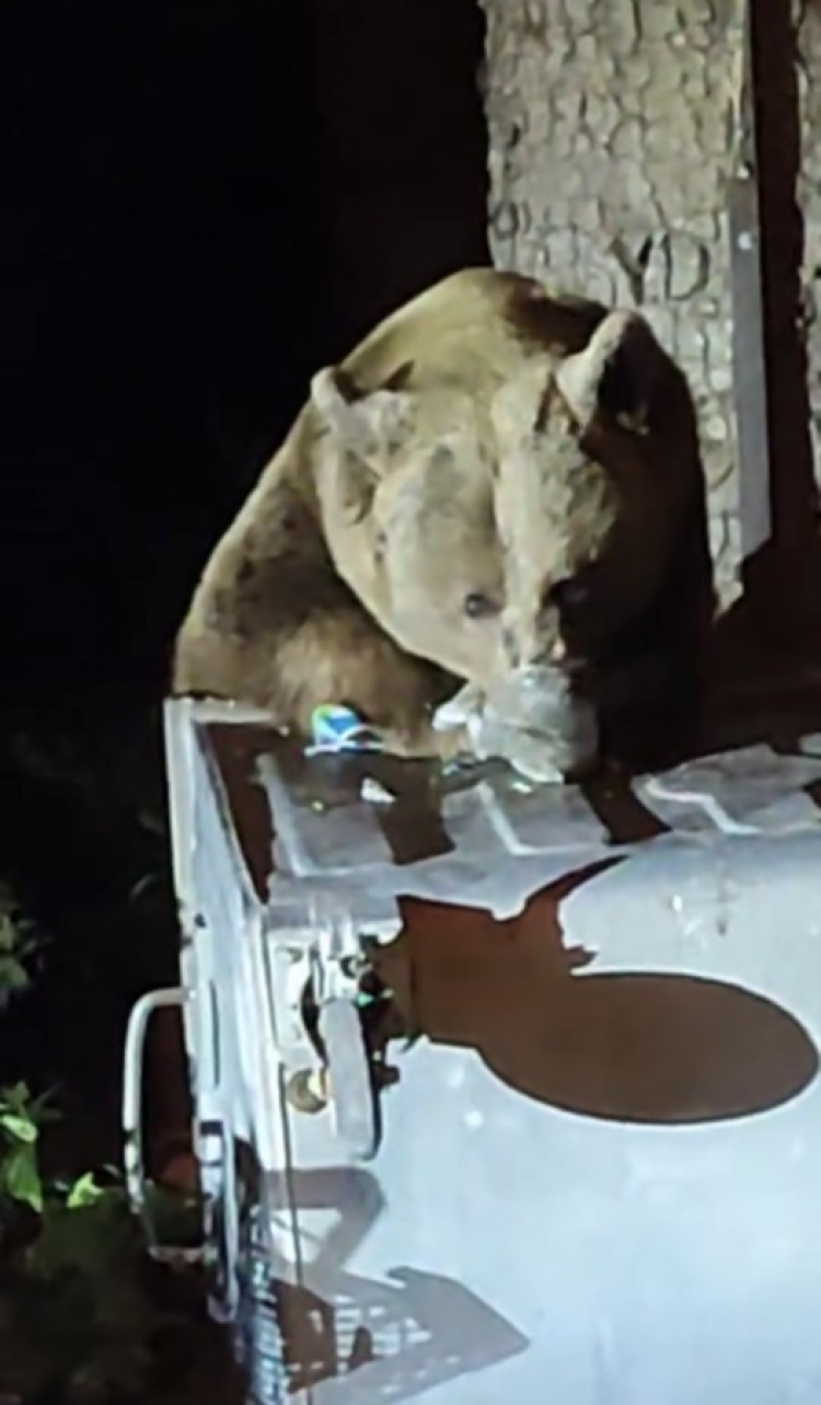 Türkiye'nin en önemli turizm merkezlerinden biri olan Uludağ'da aç kalan bir ayı, yerleşim alanlarına kadar indi. Çöp konteynerlerini karıştırarak yiyecek arayan ayı, vatandaşların cep telefonlarıyla kaydedildi.