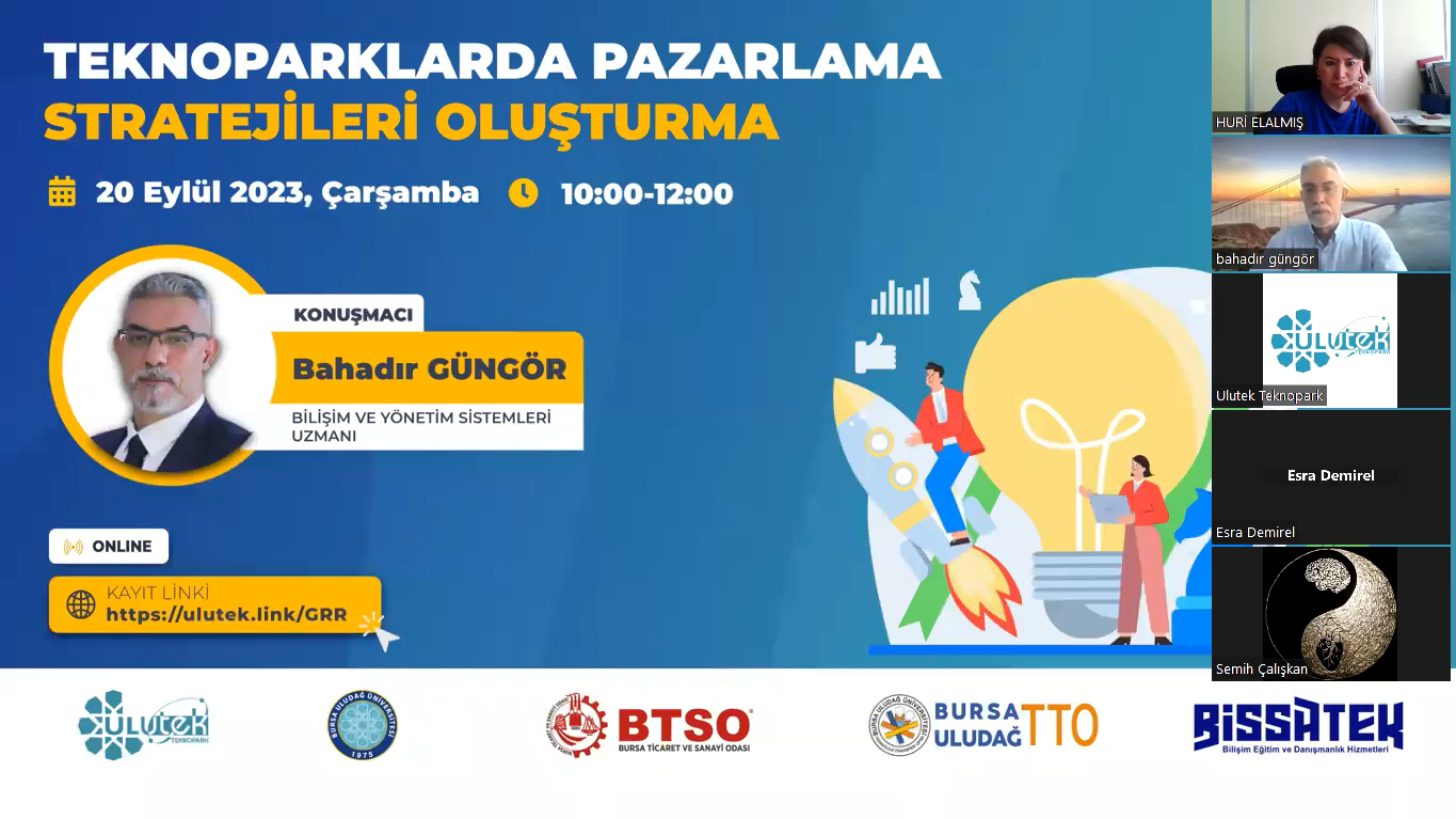 Bissatek Bilişim Eğitim ve Danışmanlık Bilişim Yönetim Sistemleri Uzmanı Bahadır Güngör, ULUTEK Teknopark firmalarına yönelik gerçekleştirilen çevrimiçi etkinlikte ‘Teknoparklarda Pazarlama Stratejileri Oluşturma’ konusunda önemli bilgiler aktardı.