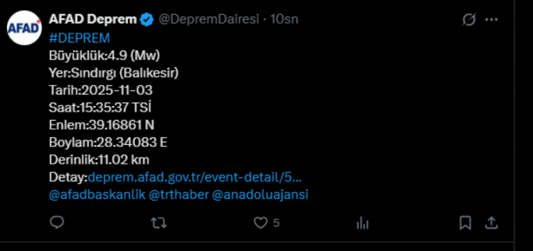 Depremi hisseden tüm vatandaşlara geçmiş olsun dileklerini ileterek sözlerine başlayan Yıldız, "Balıkesir, Sındırgı'da bir artçı gerçekleşti. 10 Ağustos ve 27 Ekim'de yaşanan depremlerin olduğu bölgede artçı sarsıntı meydana geldi. Kandilli verilerine göre 5.1 AFAD verilerine göre 4.9, EMSC verilerine göre ise 5.0 büyüklüğünde bir deprem meydana geldi. Bursa'ya 128 km uzaklıkta, 11 km derinlikte meydana gelen bir artçı sarsıntı hissettik. Ağustos'ta yaşanan deprem ana şoktu. O depremden sonra bir deprem daha meydana geldi. Simav fay zonunun Sındırgı segmentinde yaşandı" şeklinde konuştu.