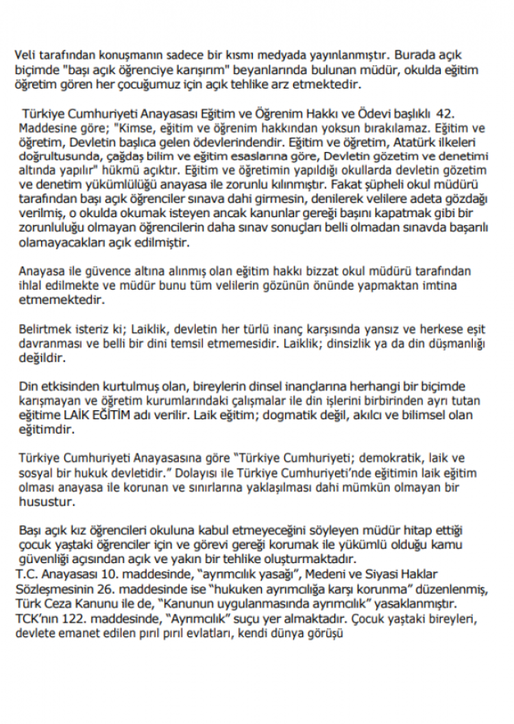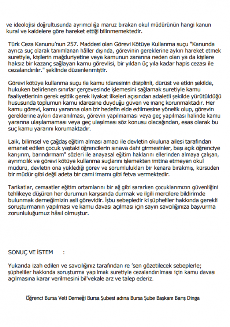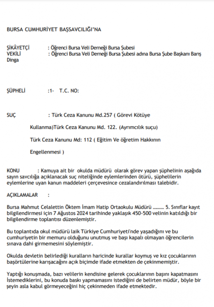 Bursa'nın Yıldırım ilçesine bağlı olan Mahmut Celalettin Ökten İmam Hatip Ortaokulu'nun okulda başı açık öğrenci istemediğini söylediğini ifade eden müdürü hakkında VeliDer Bursa Şubesi, Uluyol Adliyesi'nde bir açıklama sonrası okul müdürü hakkında suç duyurusunda bulundu.
