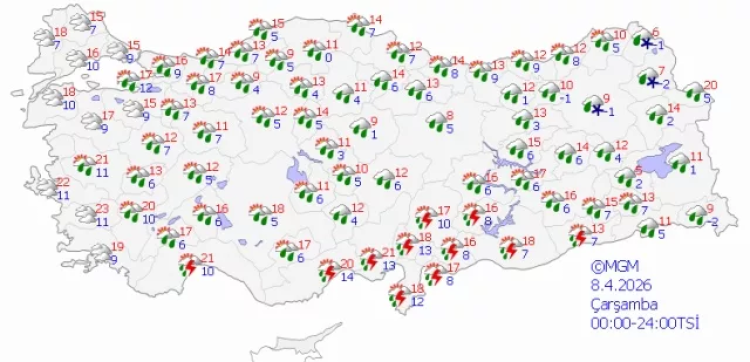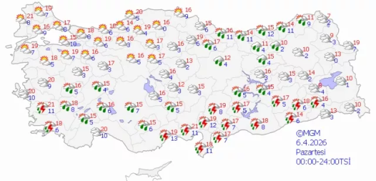 Meteoroloji Genel Müdürlüğü'nün son değerlendirmelerine göre Türkiye genelinde çok bulutlu bir hava hakim olacak. Ege, Akdeniz, İç Anadolu ve Karadeniz'in büyük bölümü ile Doğu ve Güneydoğu Anadolu bölgelerinde yağış bekleniyor. Ayrıca Balıkesir'in doğusu ile Sakarya, Bursa ve Bilecik çevrelerinde de sağanak görülecek.