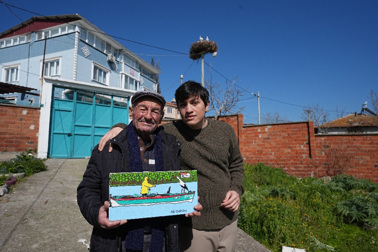 Bursa'nın Karacabey ilçesinde, Uluabat Gölü'nün kıyısındaki kırsal Eskikaraağaç Mahallesi'nin simgesi Yaren leylek ile balıkçı Adem Yılmaz'ın dostluğu otizmli genç tarafından resmedildi.