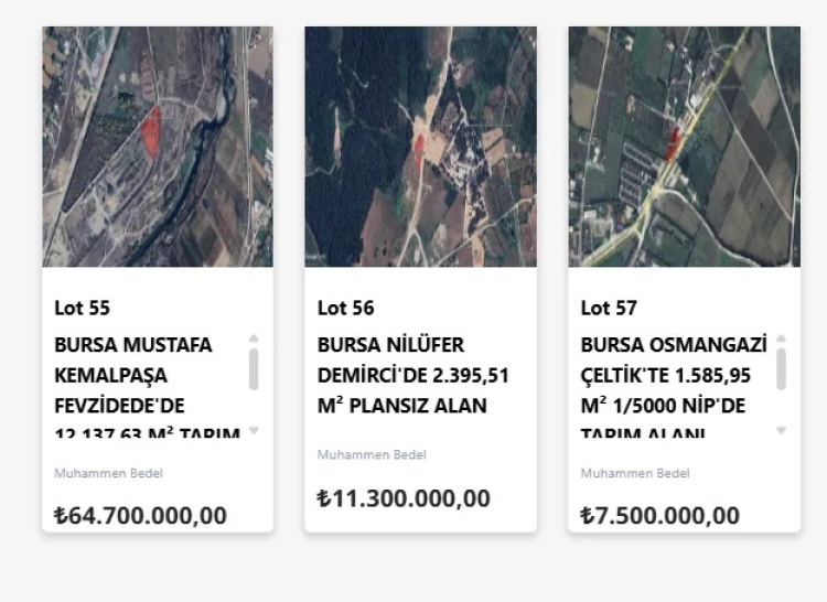 Bursa'nın MustafaKemalpaşa Fevziye'de, Nilüfer Demirci Mahallesi'nde ve Osmangazi Çeltik'te de satışa sunulacak arsalar dikkat çekiyor. Farklı büyüklük ve niteliklere sahip taşınmazlar arasında tarım arazileri, plansız alanlar ve imar potansiyeli taşıyan arsalar yer alıyor. Bölgenin gelişim potansiyeli ve ulaşım avantajları sayesinde söz konusu arsaların, hem bireysel hem de kurumsal yatırımcılar tarafından yoğun ilgi görmesi bekleniyor.