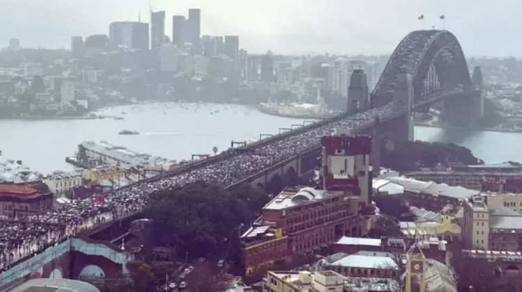 Avustralya'nın New South Wales (NSW) eyaletinin Sydney kentinde yaklaşık 90 bin kişi, Sydney Liman Köprüsü'nde İsrail'in Filistin'e saldırılarını protesto etti.