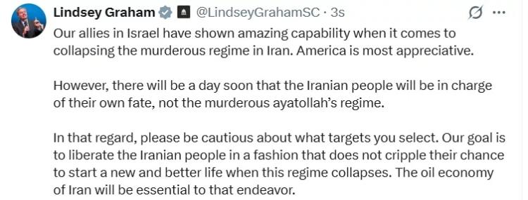 ABD'li Cumhuriyetçi Senatör Lindsey Graham, İsrail'in İran'ın petrol tesislerine yönelik saldırılarını eleştirerek, "Lütfen seçeceğiniz hedefler konusunda dikkatli olun. Amacımız, İran halkını, bu rejim çöktüğünde yeni ve daha iyi bir hayata başlama şanslarını sekteye uğratmayacak bir şekilde özgürlüğüne kavuşturmaktır. İran'ın petrol ekonomisi bu çaba kapsamında hayati önem taşıyacaktır" açıklamasında bulundu.