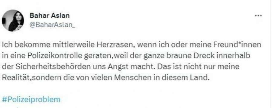 Almanya'nın Gelsenkirchen kentinde Polis Yüksek Okulu'nda "kültürlerarası yetkinlik" dersleri veren Bahar Aslan, medya hesabında bazı polislerin yabancılara karşı uyguladığı şiddeti dile getirince işten çıkarıldı. Aslan'ın "Almanya'da aşırı sağcı polislerin göçmenlere yönelik ırkçı motifli kontroller yapılıyor. Ben ve arkadaşlarım bir polis kontrolüne yakalandığımızda kalp çarpıntısı yaşıyoruz. Çünkü güvenlik makamları içindeki tüm kahverengi pislikler bizi korkutuyor. Bu sadece benim değil, bu ülkedeki pek çok insanın gerçeği" ifadelerinin ardından görevden alındı.