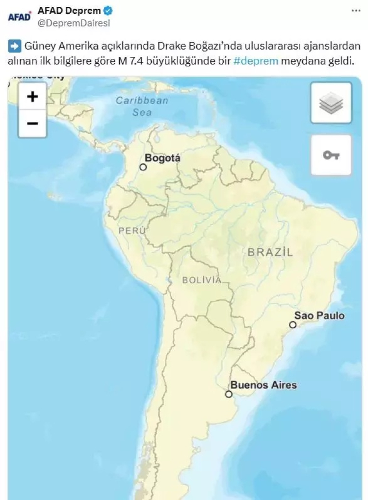 AFAD da depremi sosyal medyadan duyurdu. Yapılan açıklamada "Güney Amerika açıklarında Drake Boğazı'nda uluslararası ajanslardan alınan ilk bilgilere göre M 7.4 büyüklüğünde bir deprem meydana geldi" ifadelerine yer verildi.