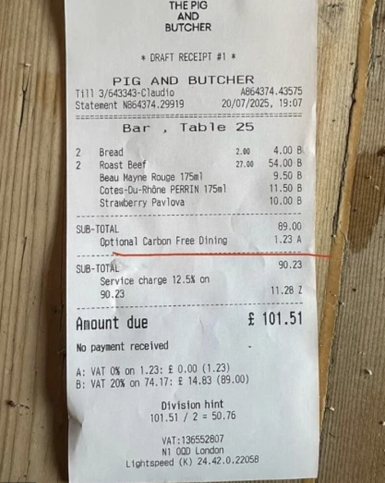 Islington'daki The Pig And Butcher'ı ziyaret eden bir müşteri, yemeklerinin toplam fiyatına eklenen 1,23 sterlinlik isteğe bağlı 'Karbonsuz' ücretini Reddit'te paylaştı.