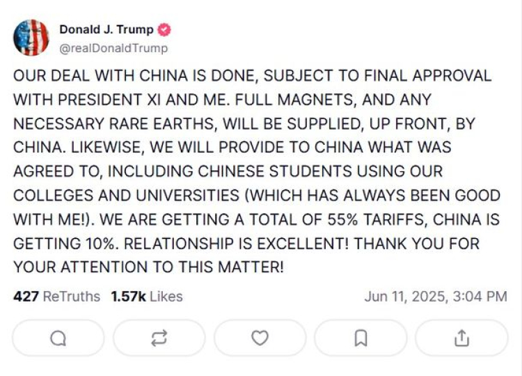 ABD Başkanı Donald Trump kendi platformu Truth Social'dan yaptığı açıklamada "Çin ile anlaşmamız tamamlandı, Başkan Xi ve benim son onayıma tabi. Tüm nadir toprak elementleri, Çin tarafından önceden tedarik edilecek. Aynı şekilde, anlaşıldığı üzere biz de Çin’e üzerinde anlaşılan şeyleri sağlayacağız. Biz toplamda yüzde 55 gümrük vergisi alıyoruz, Çin ise yüzde 10 alıyor. İlişkilerimiz mükemmel!" dedi.