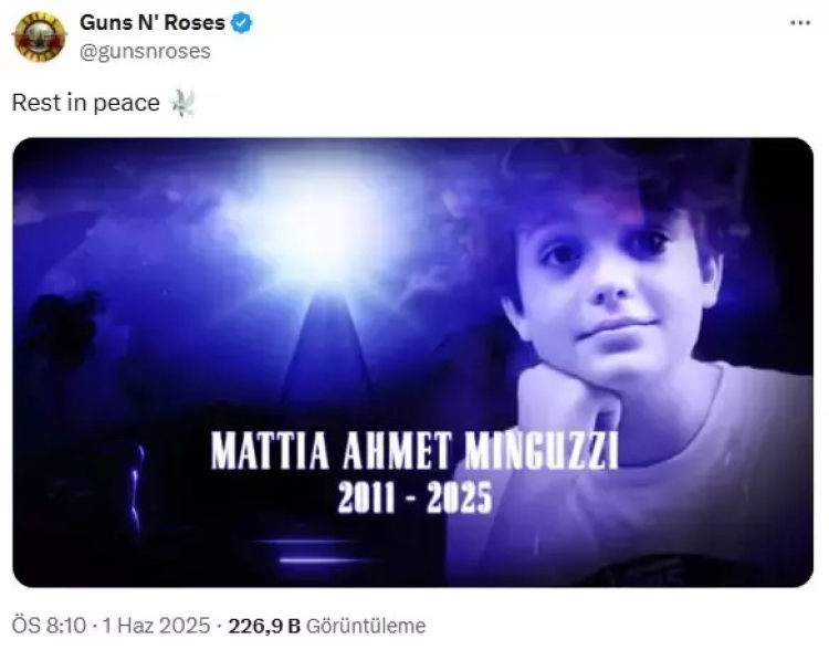Dünyaca ünlü ABD'li rock grubu Guns N' Roses, İstanbul'da verecekleri konser öncesi duygusal bir paylaşımda bulundu. Grup, Kadıköy'de katledilen Mattia Ahmet Minguzzi'yi andıkları paylaşıma, "Huzur içinde yat" notunu düştü.