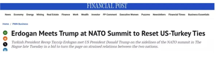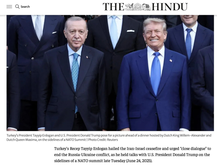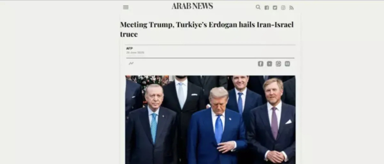 Arap basınının önde gelen yayın platformlarından Gulf News, "Türkiye Cumhurbaşkanı Recep Tayyip Erdoğan, Salı günü geç saatlerde NATO zirvesi sırasında ABD Başkanı Donald Trump ile yaptığı görüşmelerde İran-İsrail ateşkesine ilişkin değerlendirmelerde bulundu" diye yazdı.