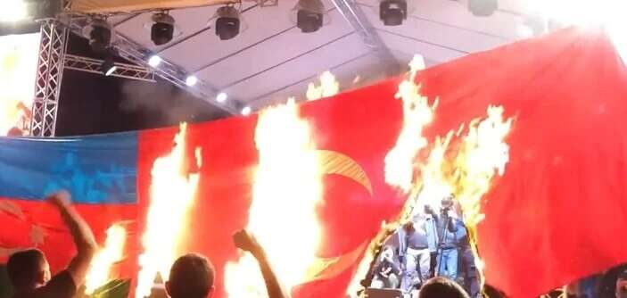 Sözde soykırım yalanıyla toplanan bir grup fanatik Ermeni, düzenledikleri etkinlikte Türk bayrağını ateşe verdi.