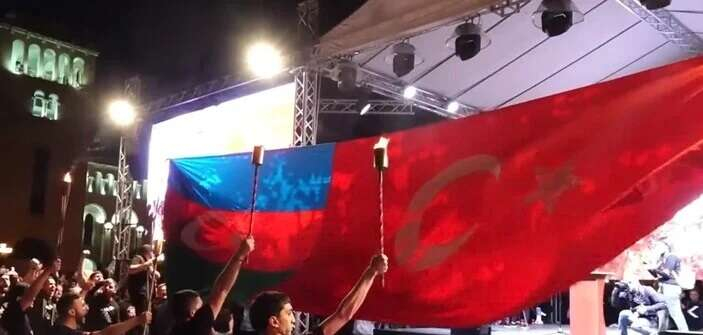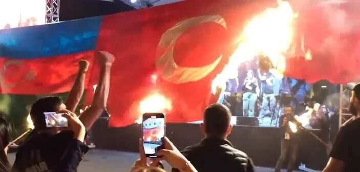 Birleştirildiği görülen Türk ve Azerbaycan bayrakları ateşe verilirken, kalabalık hep bir ağızdan slogan attı.
