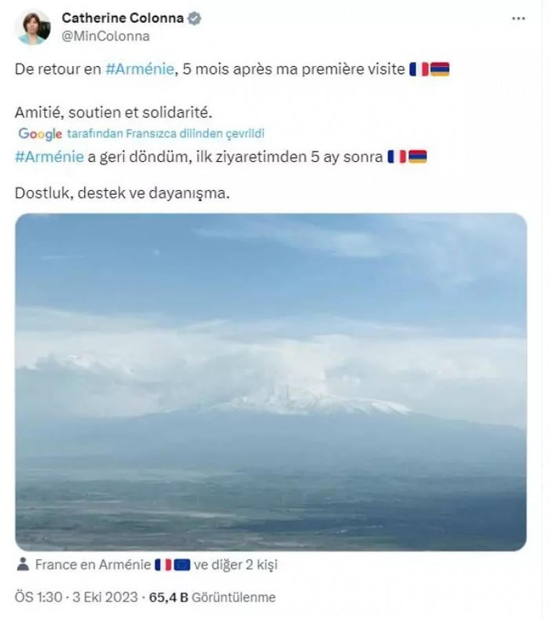 Fransa Dışişleri Bakanı Catherine Colonna, Ağrı Dağı'nı Ermenistan toprağı olarak olarak nitelendirdiği bir paylaşımda bulundu. Colonna'nın paylaşımı sosyal medyaya sert tepkilere sebep oldu.