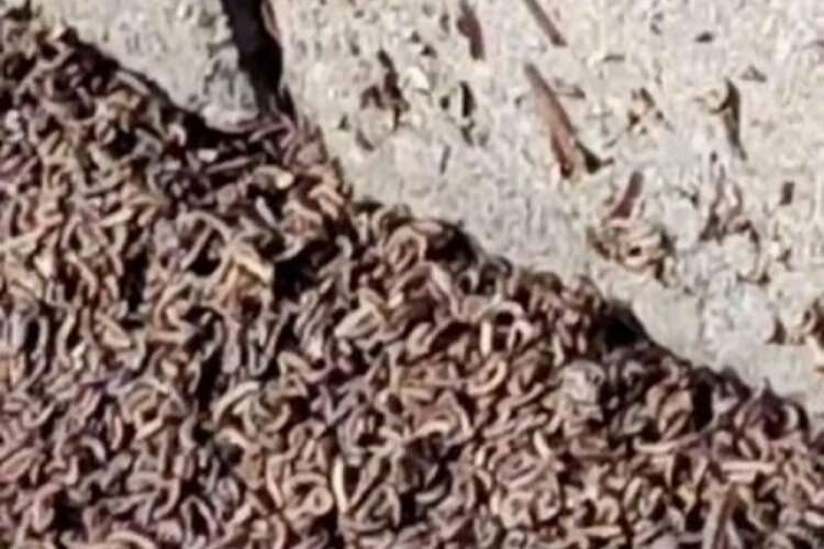 Sosyal medyada paylaşılan bir videoda tüm araç ve caddeleri yağmur gibi solucanların kapladığı görülüyor. Aynı görüntülerin devamında işe giden ve günlük rutin işlerini yapan vatandaşların solucanlardan korunmak için şemsiye kullandıkları görülüyor.