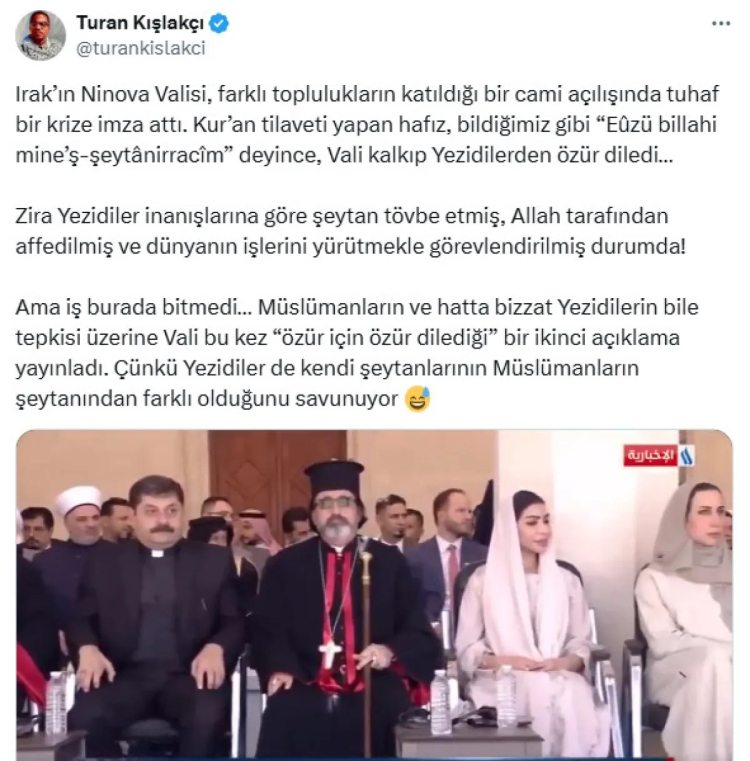 Irak'ta Vali Abdülkadir Dakhil, cami açılışı sırasında Kur'an tilaveti yapan hafızın "Euzubillahimineşşeytanirracim Bismillahirrahmanirrahim" demesi üzerine, Yezidilerden özür diledi.