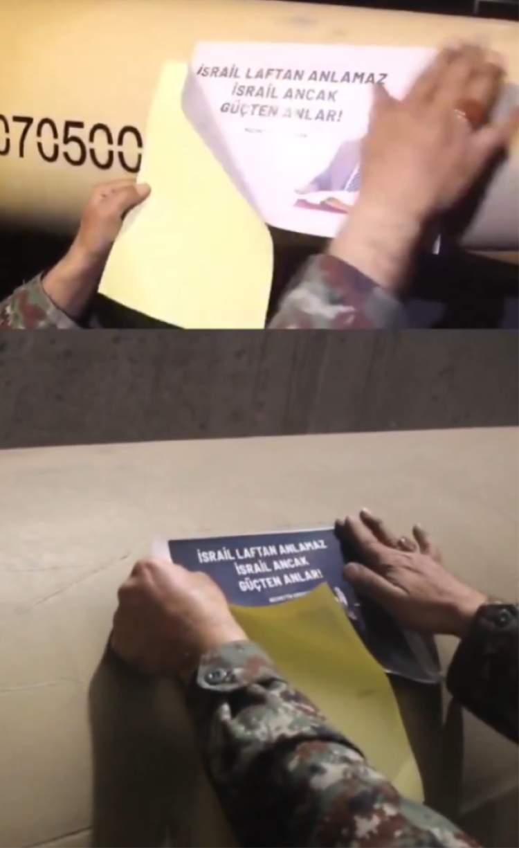 Görüntülerde askeri personelin, füzelerin üzerine Necmettin Erbakan’ın hafızalara kazınan "İsrail laftan anlamaz; İsrail ancak güçten anlar!" sözlerini hem Türkçe hem de Farsça dillerinde yapıştırdığı anlar yer alıyor.
