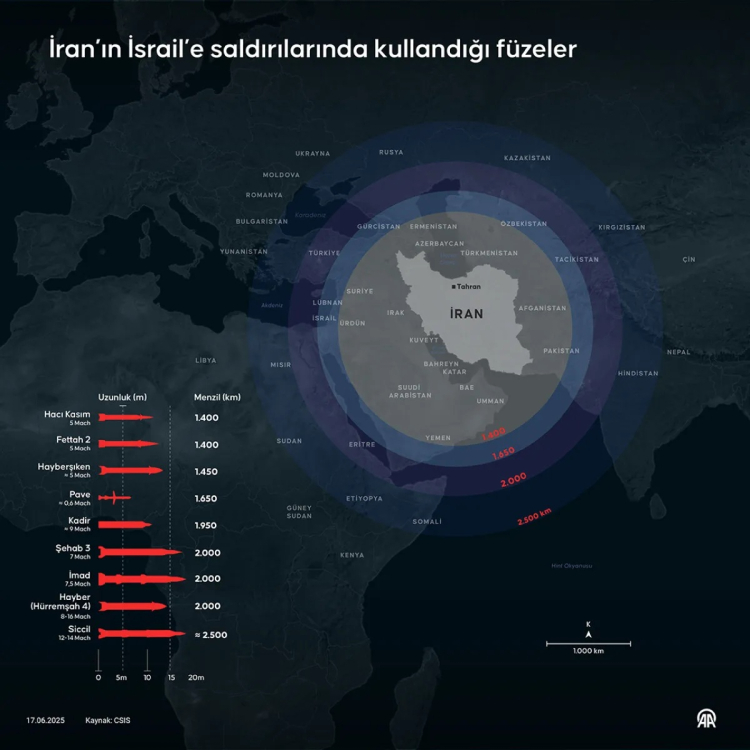 Öte yandan İran kaynaklarına göre, İsrail’e misillemelerde 1400 ila 2500 kilometre menzilli hipersonik ve süpersonik ile uzun menzilli füzeler kullanıldı.